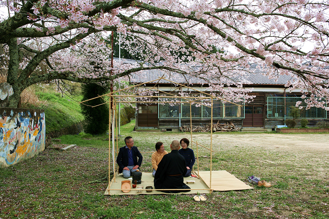 稲井田 たまに、大きなイベントに参加しますが、 気ままに行う茶会の事前告知は特にしていませ ん。その日の天候にとても左右されますし、狙うとその通りにならないものですから。戸田さんと私のスタンスは「今日、ちょっと行ってやってみましょうか」という気楽なもの。帰庵を建てて、お茶を点てて、興味ある人に中に入ってもらって、とい う一期一会なスタンスが好きかな。決め事に縛られず、自然の流れに身を任せ、ご縁のあった人が立ち止まって、入っては出て、また次の人が入って…そんなスタイルを続けていきたいです。